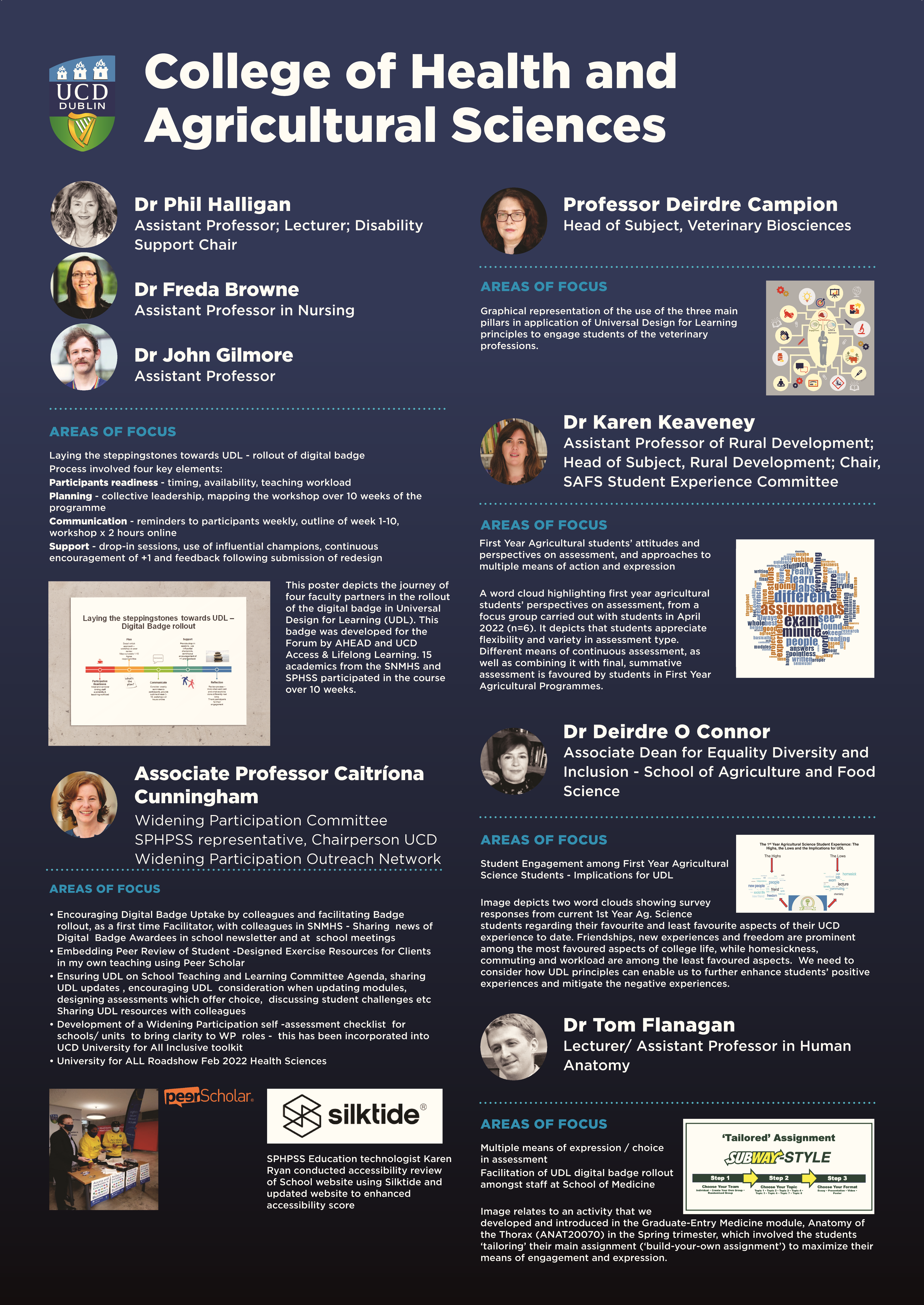 Active learning focuses on what students are ‘doing’ in the learning process. It often represents a shift of energies from the lecturer ‘doing/telling’ to students actively engaging in meaningful tasks in-class, out of class and or online. Active learning is key to student engagement, motivation and agency in the learning process. This poster depicts the journey of four faculty partners in the rollout of the digital badge in Universal Design for Learning (UDL). This badge was developed for the Forum by AHEAD and UCD Access & Lifelong Learning. 15 academics from the School of Nursing, Midwifery & Health Systems and School of Puplic Health and Sports Science participated in the course over 10 weeks.